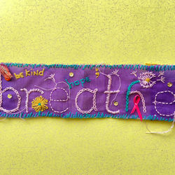 1. Connect: Each fabric envelope was specifically designed to be unfurled and cut into three equal ribbons. The first ribbon was intended to be a gift for the participant. She was asked to stitch a word or phrase mindfully that she had never heard before but was something she had always needed to hear. While rhythmically moving the needle and thread through the material, she was supposed to absorb the words and feel the benefit of acknowledging them. She was encouraged to connect with that inner part of herself. An online forum and instruction films centred on slow, mindful stitch were provided to ensure no one was left behind and everyone could collaborate and revel in as much or as little connection as needed. The second ribbon was meant to provide an additional opportunity to connect, where the participant was asked to give the ribbon to another woman and encourage her to stitch the same healing word practice. Some women stitched together outdoors and chatted; some gave their second ribbon to a neighbour, while some taught others to stitch and share their skill.